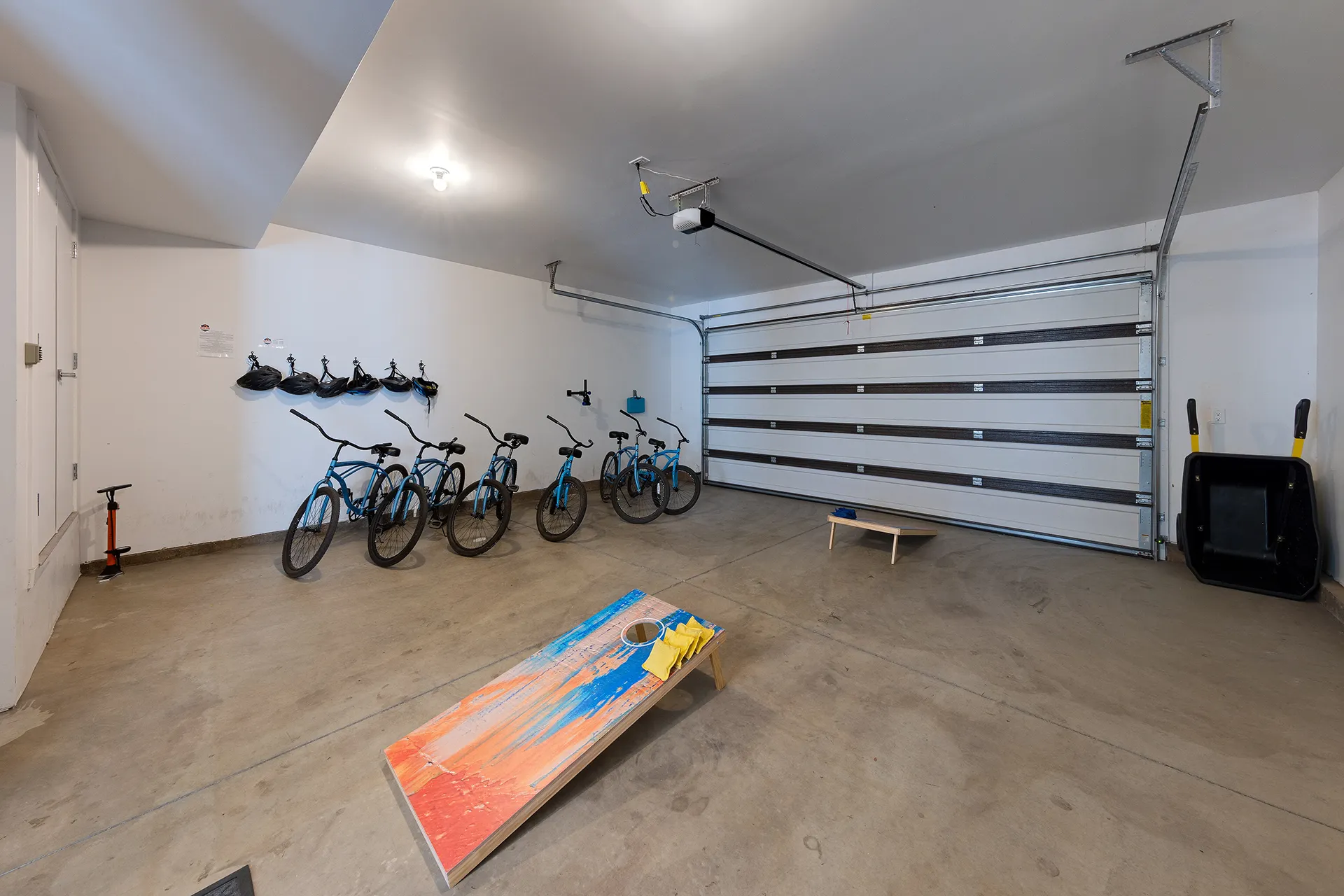 The two-car garage is one of the most practical features of this property for the Moab traveler. Six cruiser bikes with helmets are included at no extra charge — downtown Moab is less than a mile away and easily reachable without a car. The garage also includes a floor pump, a mounted bike repair stand with basic tools for guests bringing their own bikes, a cornhole set, and a Gorilla Cart for hauling gear. For guests arriving with high-value Jeeps, off-road vehicles, or mountain bikes, secure covered parking is available right at your front door. Motion-sensing lights activate automatically inside the garage so you're never fumbling in the dark.
